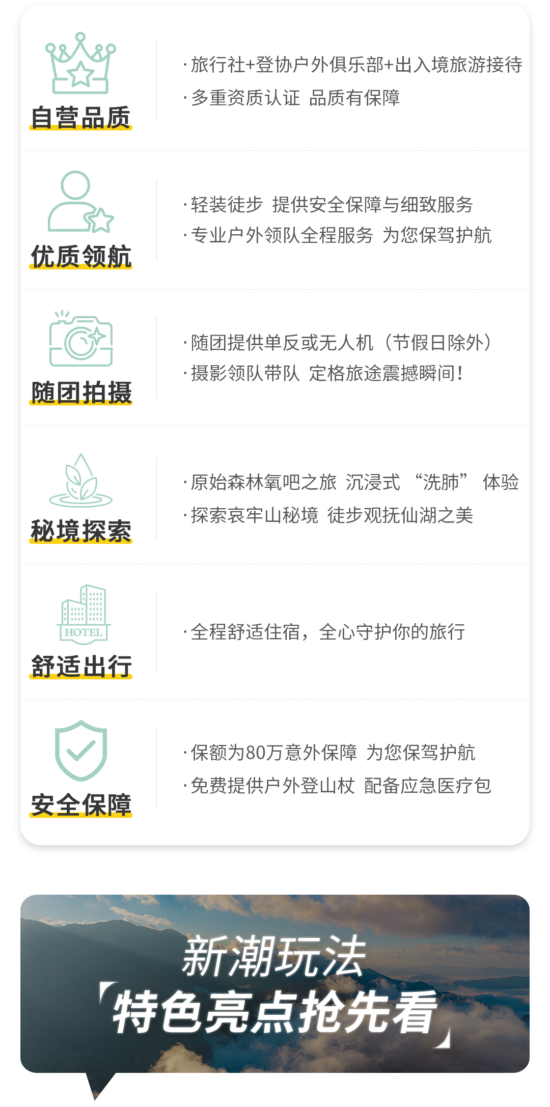 4、工作人员:专业户外领队全程服务(1:10配比),4人以内司机兼领队;