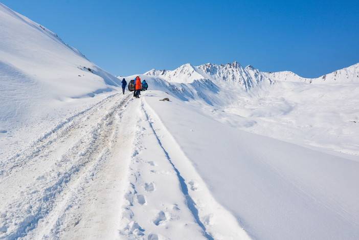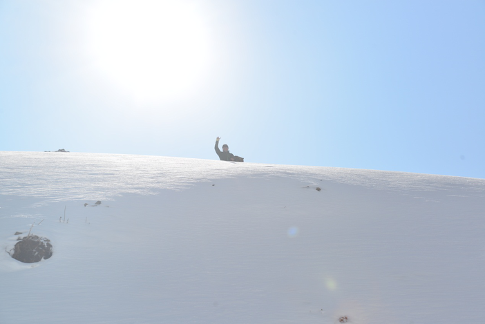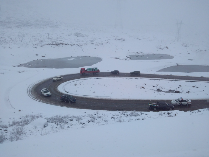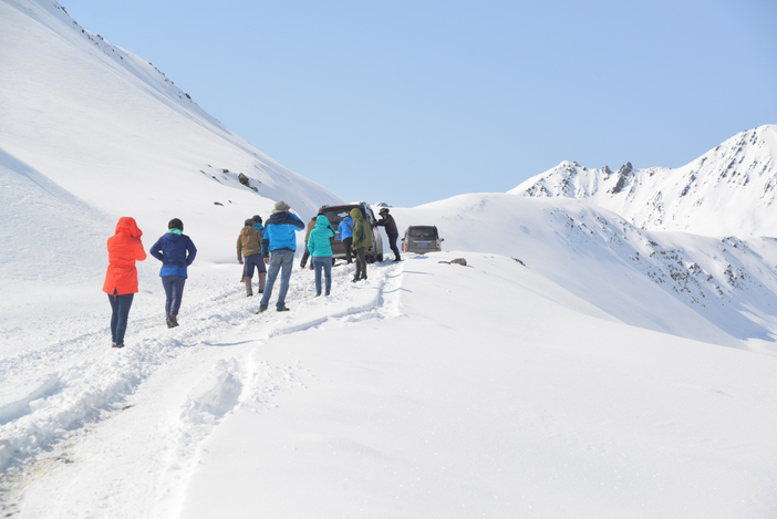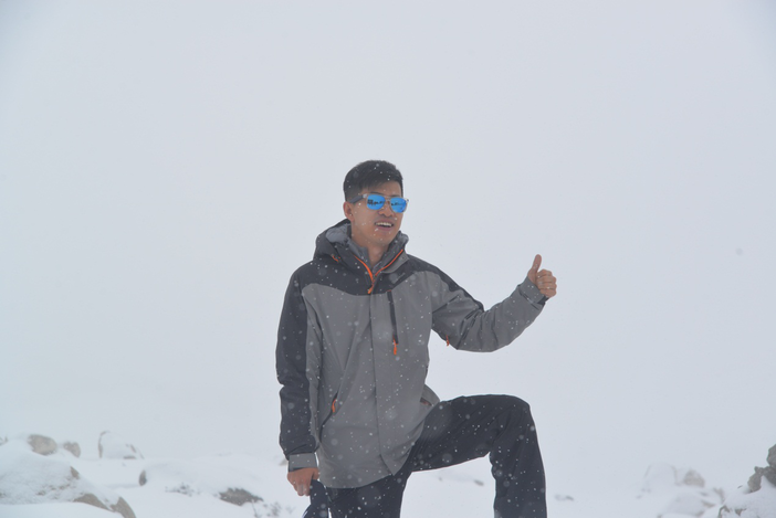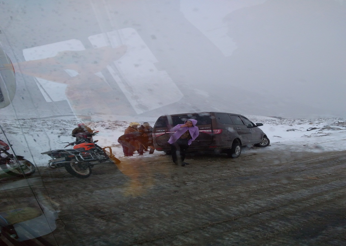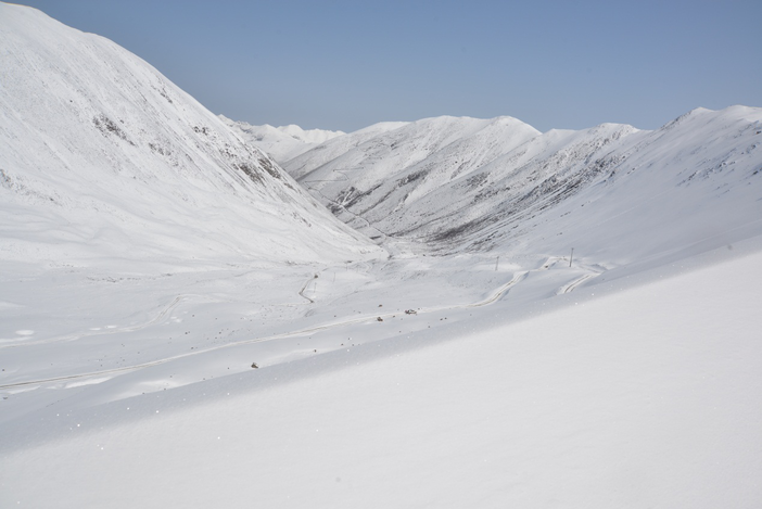 早上9点,我们从登巴客栈出发,去子梅垭口,在距离垭口1km处,由于雪太大了,实在没办法载人继续前进了,我们就只有下车轻装徒步上子梅垭口