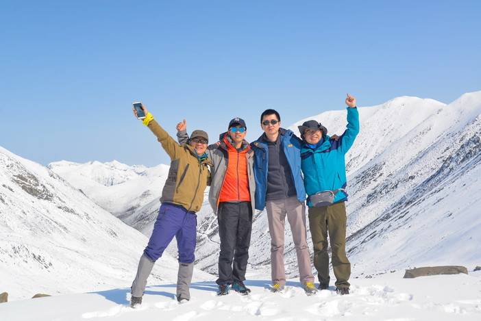 拍照于雪景泉华滩的他们