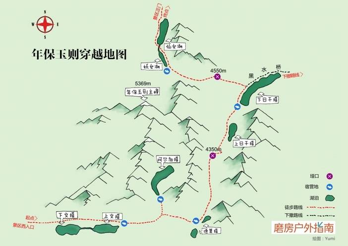 年保玉则的穿越路线选择很多,北南走向为正穿路线,南北走向则为反穿路线,也有从黑水桥、下日干措两条下撤路线开始的非传统走法。此次走的是正穿路线,正穿相比反穿拥有两大优势:1,风景越走越美。2,线路越来越轻松 正常的年保玉则穿越全程约49km,体力良好且行程顺利的驴子3天便可以完成全程穿越。
