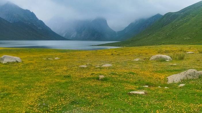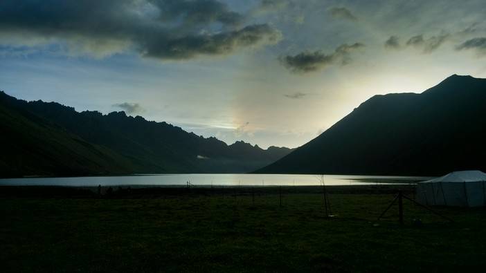 2016年6月27日,醒来听到的哒哒哒雨滴密密麻麻落在帐篷上的声音,今天早晨的妖女湖静悄悄,特别的凌静,远处使我们营地