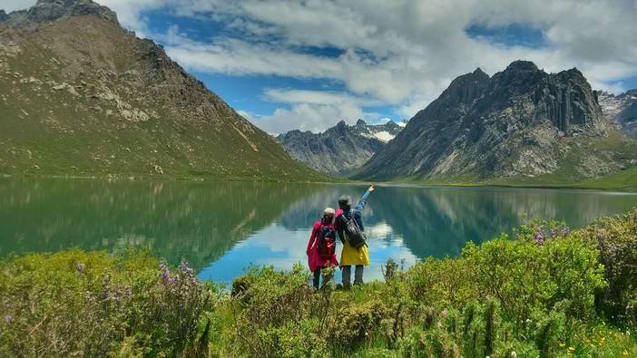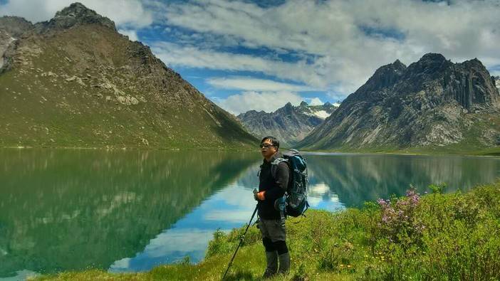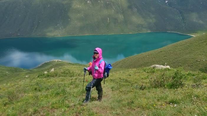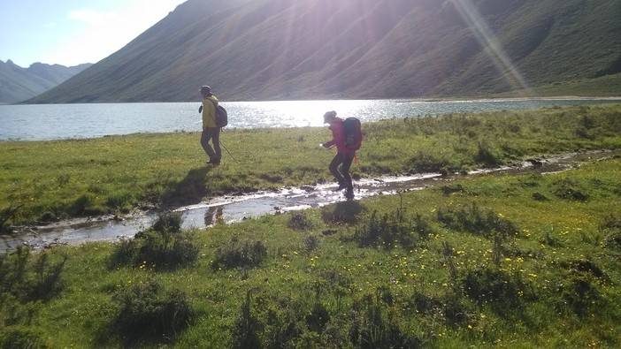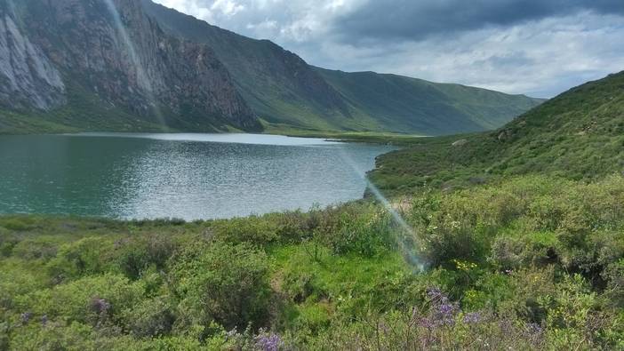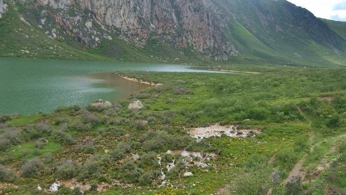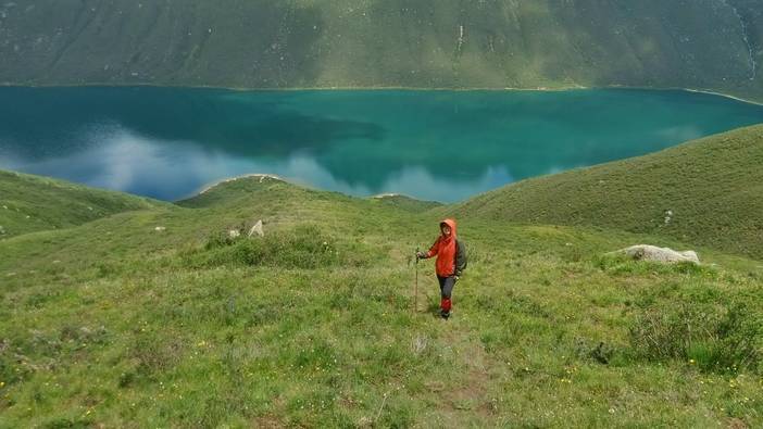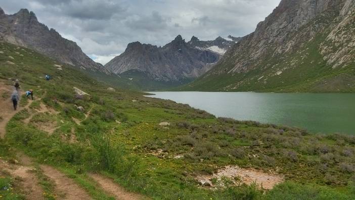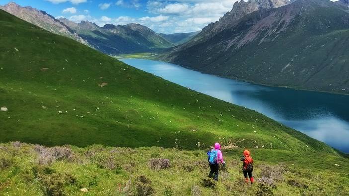 沿着山脊没下多久就能看到山下碧蓝的湖泊,下日干错的美景。