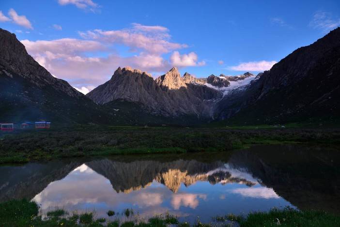 一块较平缓的草垫上竖起了一顶白色的炊事帐篷,旁边还有马帮的马儿在悠闲吃草,还有我们晒在营地的帐篷,群山环抱的山下则是极美的上下日干措营地。
