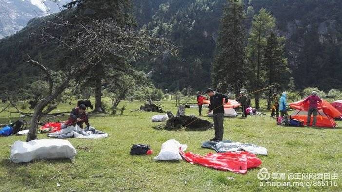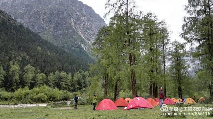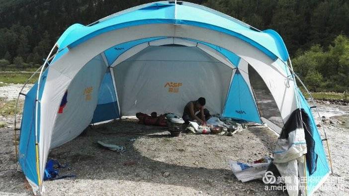 第二天长坪沟走到了尽头,继续露营在山谷之中!炊事帐篷已搭好,领队亮仔开始给大伙儿准备晚饭!