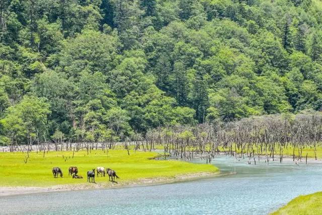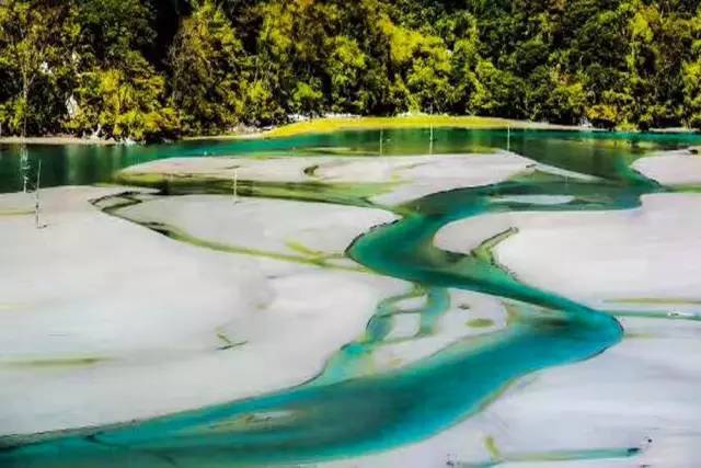 巴旺海澄碧的湖水与雪山融为一体,海子中细沙沉积,形成色彩斑斓的河床,仿佛令人置身海滨。