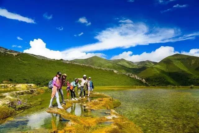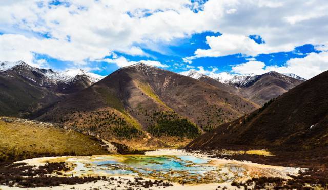 泉华滩的地质地貌类似于黄龙的钙化池,但是相比于黄龙,泉华滩更原始偏僻,游客很少,而且可观赏蜀山之王--贡嘎山。