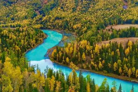 一进入9月,喀纳斯便进入了纯金的时节。天高云淡,蓝天如洗,层林尽染,满目流金,深绿的山坡上透出一片片黄枝红叶相间、青山白雪相连的色块,湖畔的白桦、红松、冷杉等树木会以金黄、橙红、黛绿等交叉的色彩,烘托着山顶耀眼的雪色,投映在翡翠石般的喀纳斯湖上,光彩夺目,令人沉醉。此时也是徒步探索喀纳斯最佳时节。