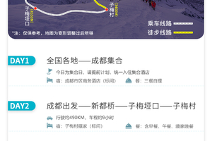 (3)行程第一天为成都集合时间,当天晚上到成都都可以,第二天早上在集合酒店出发。正常情况下,行程最后一天为晚上8点左右抵达集合酒店散团。
