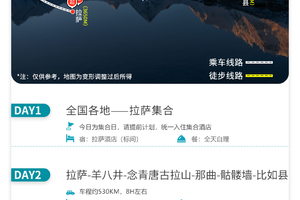 D1:拉萨集合 今日全国各地的队友将来到拉萨集合,统一入住我俱乐部安排的酒店。如果您的时间比较宽裕,可以自行安排在拉萨市区的旅游活动,拉萨火车站距市区10公里,可打车到集合酒店。贡嘎机场距拉萨市区65公里,可乘坐机场大巴到拉萨贡嘎机场乘车点民航局门口下车,再打车到集合酒店办理入住,当天尽量少运动,多休息。晚上会统一召开行前见面会,讲解本次活动注意事项。