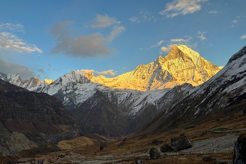 今天是最精华的一天,清晨早起拍摄安纳普尔纳群山的日照金山, 此时清晨的阳光洒在安纳普尔纳珠峰上,背后是鱼尾峰,群山环绕,蔚为壮观。早餐后下撤, 前往今天的营地Bamboo(海拔2310米).