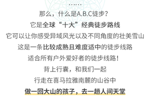 尼泊尔被誉为“徒步者的天堂”,ABC是指安纳普尔纳保护区线路/安纳普尔纳登山大本营,徒步时间5天,沿途有很多客栈提供休息和用餐,是一条非常成熟的徒步线路。ABC是尼泊尔最为著名和受欢迎的徒步线路之一,难度不大,体验非常丰富,适合所有徒步爱好者!