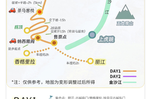 早上8:00左右在云南丽江古城南门口集合,乘车前往徒步起点开始徒步,途径海拔2200米的纳西雅阁后休整,到达海拔2650米的茶马古道28道拐,大约下午5:00到达住宿的客栈。