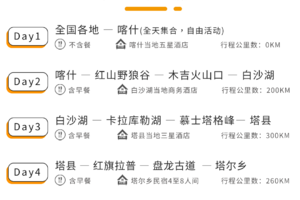 注:塔莎后半段因地势常年受天气影响出现封路情况,如遇此情况,我们将沿G314原路返回喀什,不再经过莎车古城,请悉知!