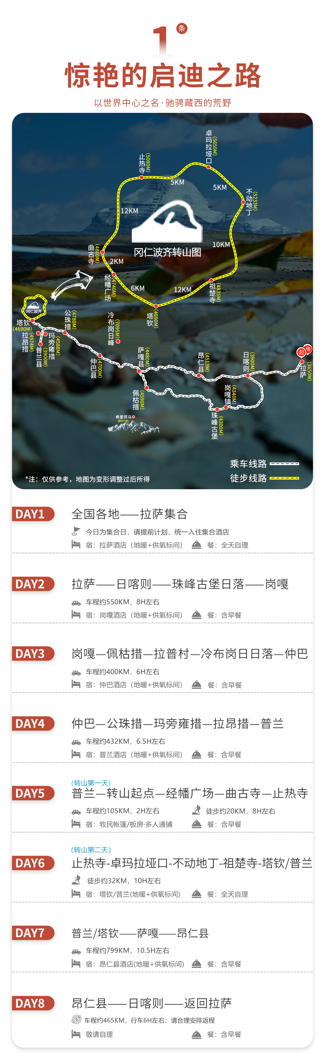 (2)全程徒步约52公里(冈仁波齐转山),徒步最高海拔为卓玛拉垭口5650米左右,住宿最高海拔为止热寺5080米。