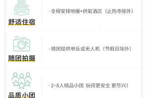 3、单房差:单人出行则安排拼房,若未拼到,则需要补单房差,详情请咨询客服(单人提前7天报名,免收自然单房差);